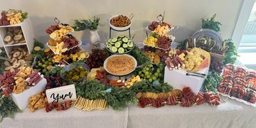 A spread featuring a variety of cured meats, artisanal cheeses, fresh and dried fruits, gourmet crackers, breads, veggies, nuts, olives, dips, and sweet accents. Perfect for mingling, munching, and making an impression.
